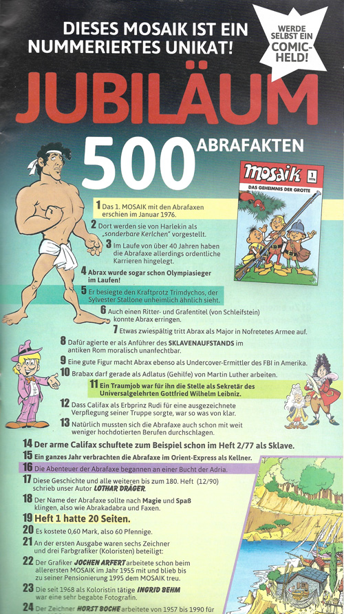 | | | Der 16-seitige überformatige Beileger ist ins Heft 500 "Mosaik 500" eingeheftet. Wie der Name schon verspricht, werden darin 500 "Abrafakten" aufgelistet. Im Fakt 500 werden 1000 Fakten für das 1000. Mosaik versprochen. |